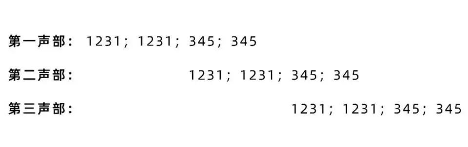 而此時,第一聲部的旋律卻是3 4 5;34 5,如此一來,兩條相同的旋律在“縱向”上有了音程關係,構成了更為複雜的“織體”。