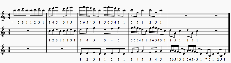 此時,在第二個聲部演奏一小節之後,第三個聲部也開始以低八度的方式加入,並演奏1 2 31;1 2 3 1。