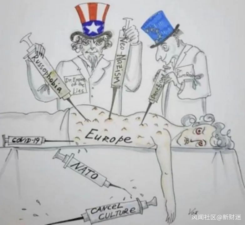 上面這張圖,除了山姆大叔以外,還有一位頭戴歐盟標誌的推手,至於這些碩大的針管上所寫的,分別是:新冠病毒、新納粹主義、恐俄症、取消文化和制裁。手術枱上躺着的,則是被反覆折磨的“歐洲人”。