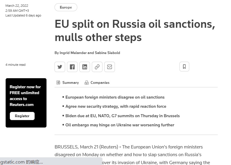 2. 歐盟糾結於制裁俄能源,3月21日歐盟外長會議,德國堅決反對制裁俄能源,因歐洲40%的天然氣都從俄羅斯進口,立陶宛要追隨美英制裁俄能源。