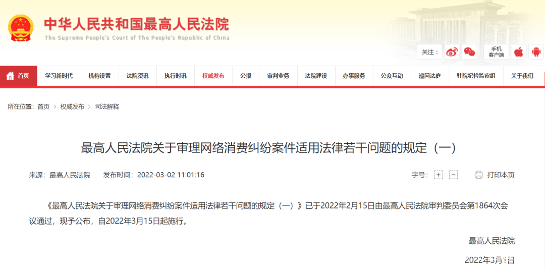 在今年 3 月 2 號的時候,最高人民法院通過了一條**《 最高人民法院關於審理網絡消費糾紛案件適用法律若干問題的規定( 一 ) 》。**