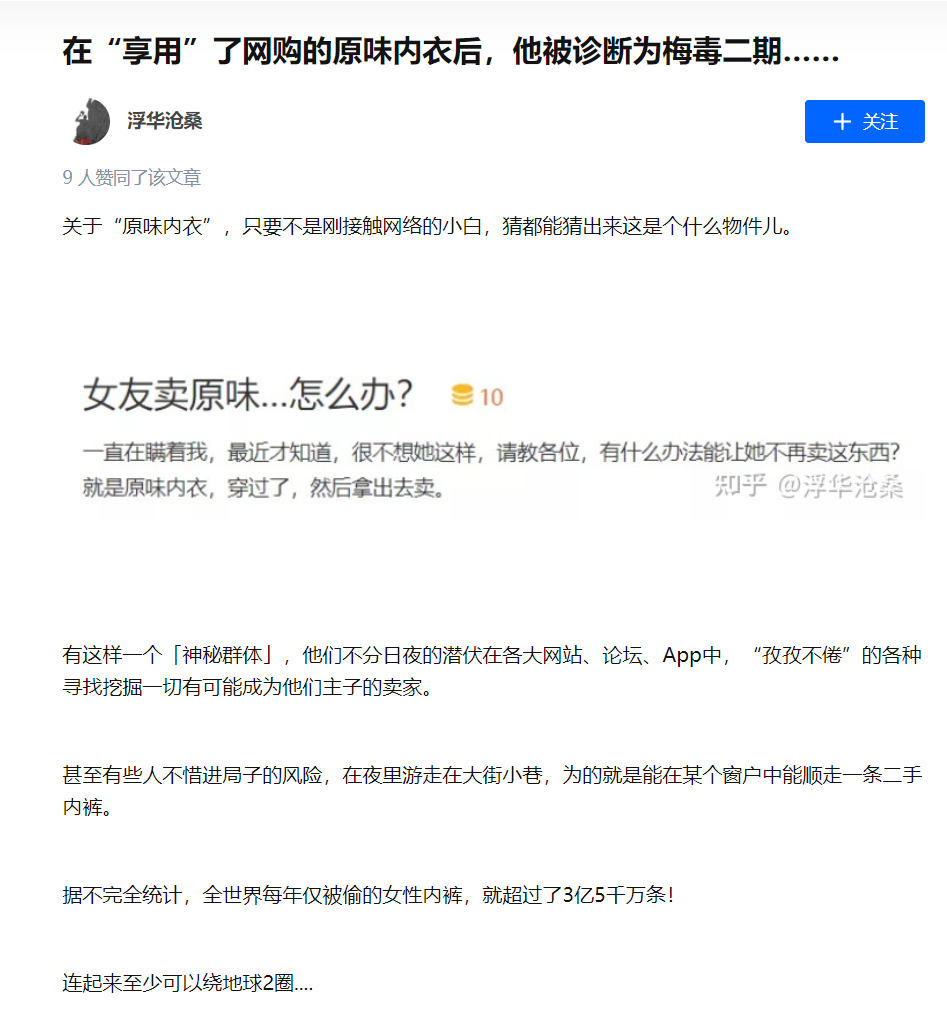 知乎: @浮華滄桑在 “ 享用 ” 了網購的原味內衣後,他被診斷為梅毒二期……