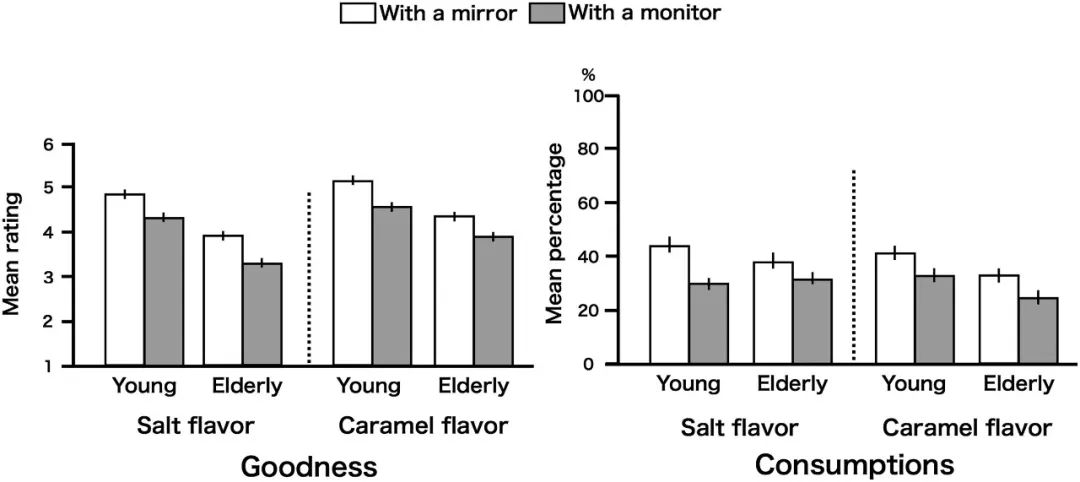 但2015年,研究者又發現了另一個奇怪的現象:當互相不熟的A和B一起吃巧克力時,就算他們沒有任何交流,他們也覺得巧克力更好吃。而2017年的研究又發現,即使沒有人陪,一個人對着鏡子吃或對着自己的照片吃爆米花的人,也會覺得爆米花更好吃,並且會吃更多。