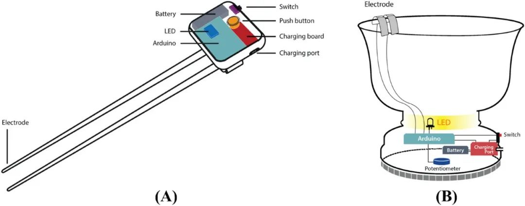 這是一套帶電的餐具。如圖所示,他們在筷子的末端和碗底部都裝上了電機,會產生微弱的電脈衝(電流幅值為40 μA和180μA,對人來説十分安全)。