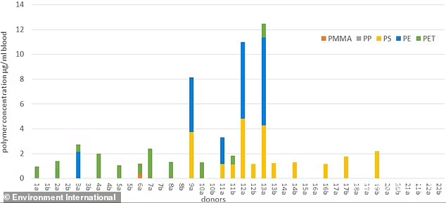 大約一半的血樣顯示出PET塑料的痕跡,這種塑料被廣泛用於製造飲料瓶、礦泉水瓶。而超過三分之一的血樣含有PS,這種塑料用於一次性食品包裝材料和許多其他產品。