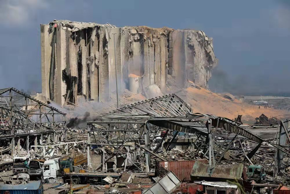 2020年8月5日,在黎巴嫩首都貝魯特拍攝的損毀的小麥倉庫。新華社發