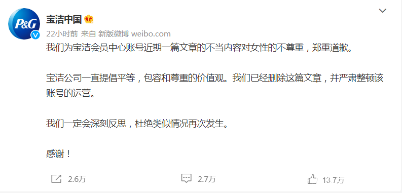 回到侮辱女性事件,寶潔本就將女性定義為主要消費羣體,為了刺激女性消費使用惡劣性質的文字進行性別營銷,無疑是在增加女性對自身的“性別焦慮”,儘管旨在利用科普營銷,但措辭不當很容易造成消費人羣的流失。