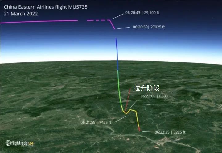 而且FlightRadar24上的數據顯示,飛機在墜落過程中有個短暫的拉昇,超重感對一般乘客應該是難以承受的,但經過專業訓練隊的駕駛員能扛一下。因此,這個短暫的拉昇很有可能是機長的自救。只不過飛機部分部件(如新聞裏面報道的機翼)斷裂或脱落,飛機變得完全不受控,最終再次掉頭向下,直至墜落。