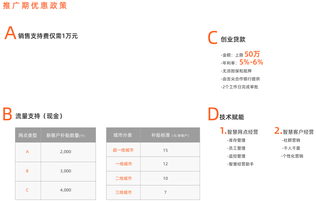 在舌尖英雄的招商頁面,螺旋君瞭解到其對於合作經銷商的更多支持政策,其中包括創業貸款、流量支持和技術支持等。