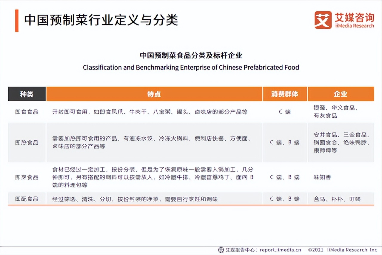 何為預製菜,根據艾媒諮詢發佈的研究報告,其將預製菜分為了四個大的品類,包括即食食品、即熱食品、即烹食品和即配食品。