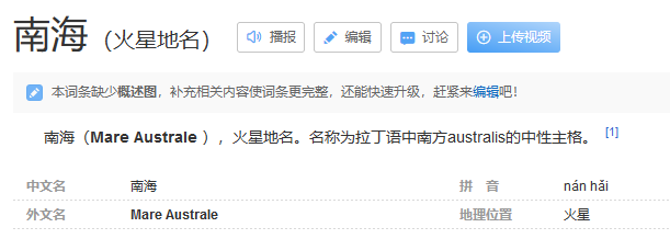 南海Mare Australe,這個是個人最為滿意的一個。首先佛山的“南海”不是海,但是距離那個是海的“南海”並不遠,所以south sea這類大實話不能用。後來有朋友提醒,美國有不少來自歐洲或者拉丁美洲的地名。於是從西班牙語開始找,找到拉丁語(對我這種西語文盲來説,這倆其實差不多),確定了Mare(這個詞其實對應英語應該是Marine)。然後再找拉丁語的“南方”,結果一個Mare Australe映入眼簾——就是它了