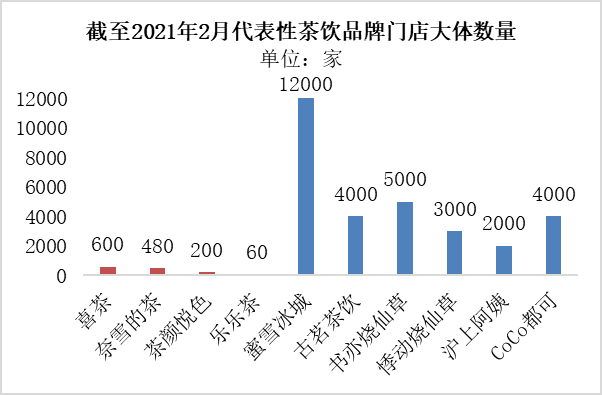 截至2021年2月,喜茶在國內的門店數量大致為600家,但以加盟經營為主的蜜雪冰城、CoCo都可的門店數量已分別達到近12000家、4000家。