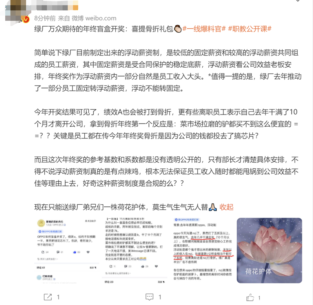 近日,某博主在社交平台爆料,OPPO員工的年終獎縮減嚴重,該博主戲稱為“喜提骨折禮包”。