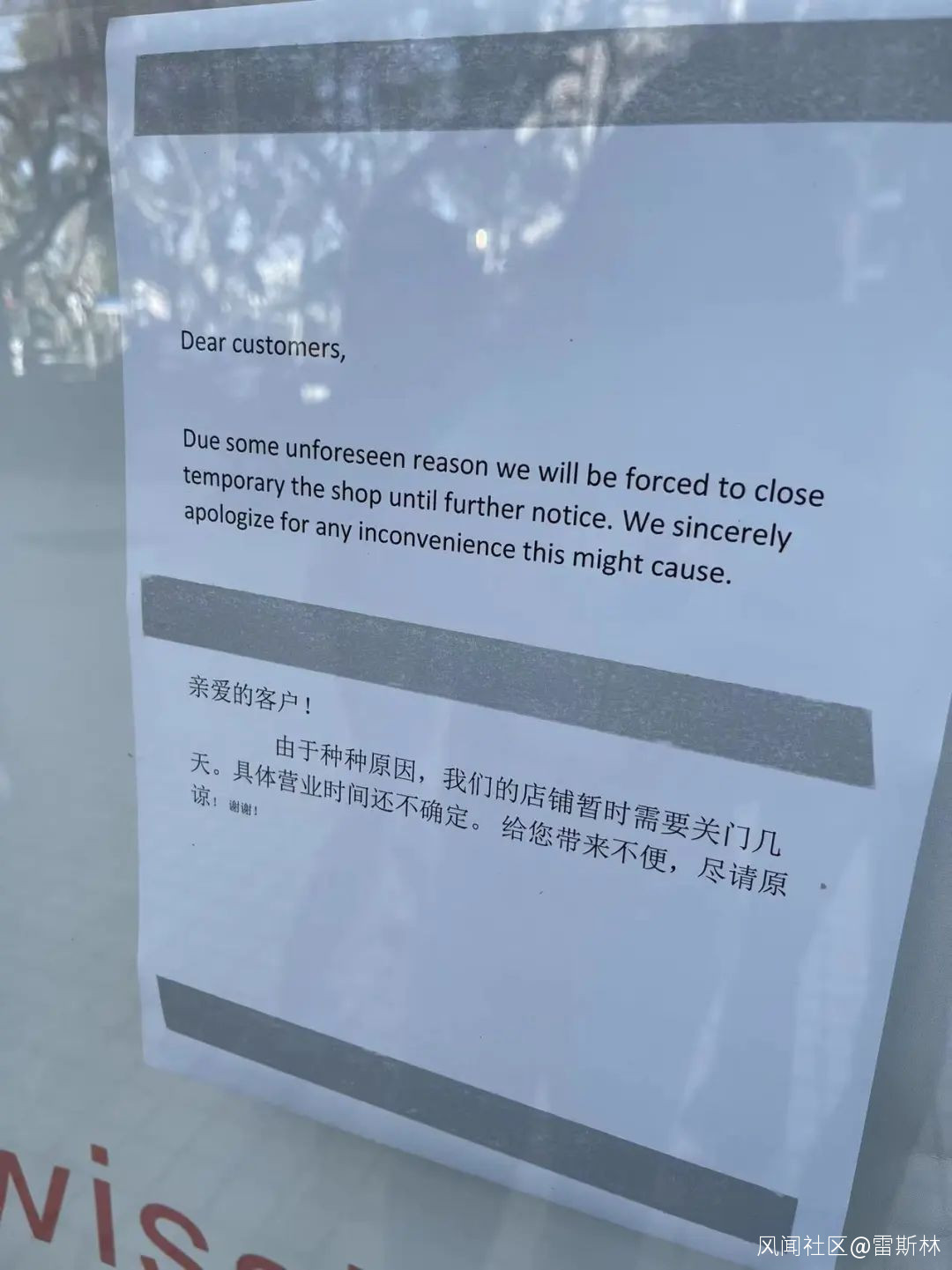 英文是“因為不可預料的不可抗力我們不得不關門了,也不知道啥時候能開門。”
