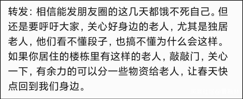 這時候如果你居住的樓棟裏有這樣的老人,敲敲門,關心一下,有餘力的可以分一些物資給老人,讓春天快點回到我們身邊。