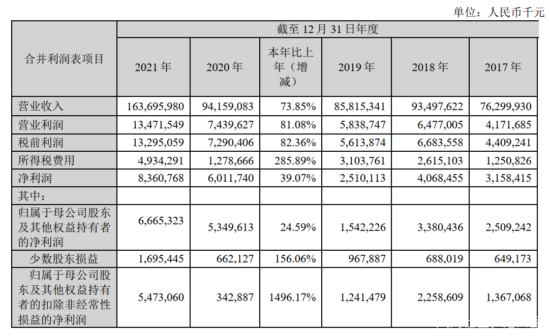 3月29日,中國國際海運集裝箱(集團)股份有限公司(簡稱“中集集團”,000039)發佈了2021年年度報告。2021年,中集集團實現營業收入人民幣1636.96億元,同比上升73.85%;實現歸屬於母公司股東及其他權益持有者的淨利潤人民幣66.65億元,同比上升24.59%;實現基本每股收益人民幣1.81元,同比上升28.37%。基於優異業績,中集集團向股東派發全年股息每1股現金人民幣0.69元(含税),不送紅股,以資本公積金向全體股東每10股轉增5股。主要財務數據如下圖: