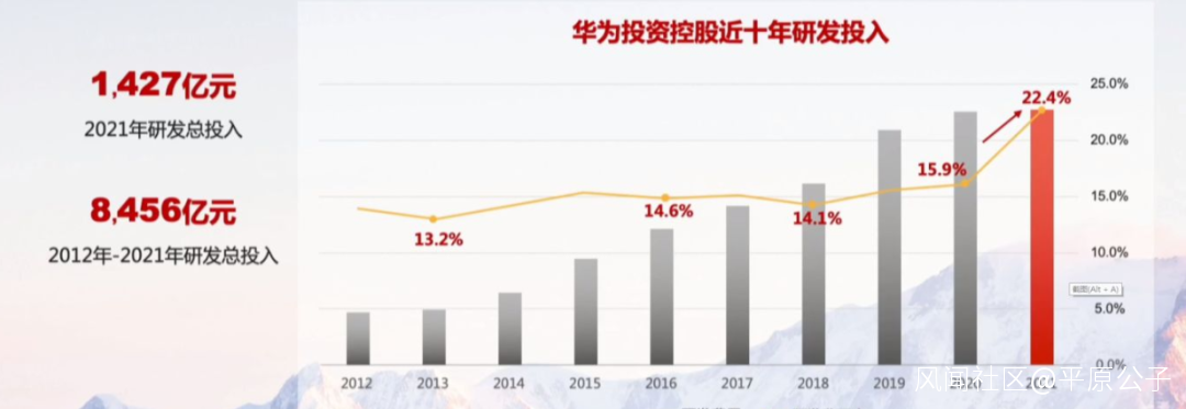 2021年研發投入達到1427億元,創下華為歷年研發最高紀錄,佔全年收入的22.4%,排名全球第二,僅次於谷歌母公司Alphabet。