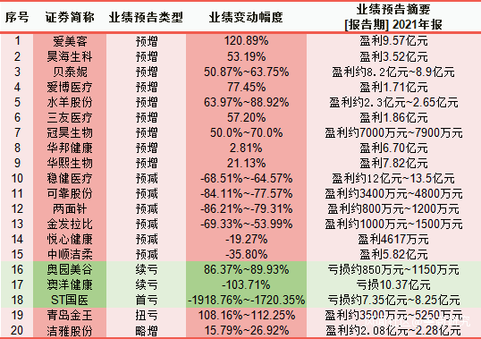 從財報披露數據看,大部分醫美概念股都還處於良性發展階段。3月18日,在A股醫美概念股板塊的37只個股中,已有20只醫美股披露了2021年業績,其中17家預計盈利,佔比85%,分別為愛美客、貝泰妮、華熙生物、華邦健康、昊海生科、水羊股份、三友醫療、愛博醫療、冠昊生物、穩健醫療、中順潔柔、悦心健康、可靠股份、金髮拉比、兩面針、青島金王、潔雅股份等;3家業績虧損,分別為奧園美谷、澳洋健康、ST國醫。