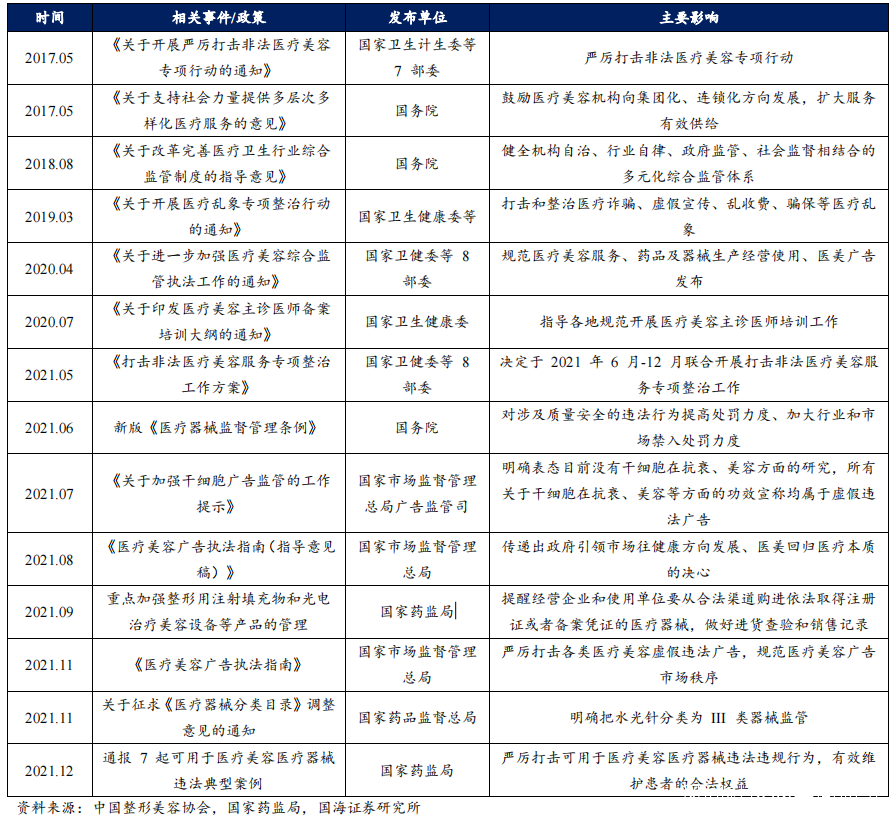 無獨有偶,正是在醫美行業負面輿情逐漸嚴重的2017年,中國醫療美容行業亂象開始引起國家有關部門高度關注,各項政策法規密集出台、非法醫美整治行動多次開展。只是到了2021年下半年監管節奏明顯加快,系統性監管和整治工作已展開,醫美行業正式進入“強監管”時代。
