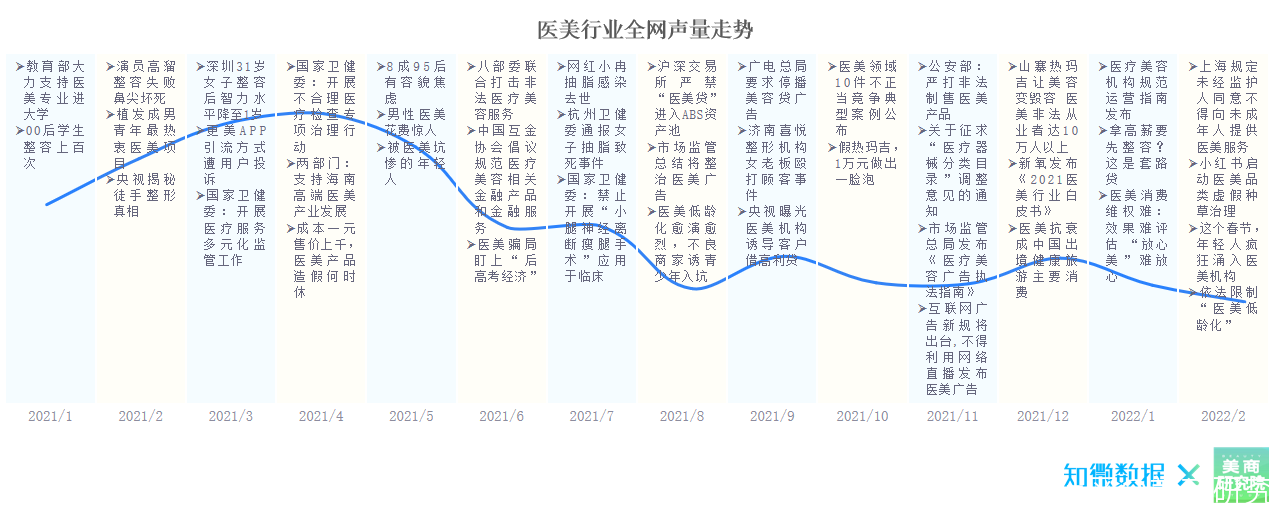 知微研究院數據顯示:2021年1月-2022年2月,全網有關醫美行業的相關報道近254萬篇,且大部分是監督報道。自2021年4月起,隨着監管部門對醫美行業監管力度逐步加強,醫美行業在輿論場上的熱度得到一定程度遏制。醫美營銷類廣告有所減少;同時,權威媒體緊跟監管部門動作,相關報道量有所上升。尤其是2021年315期間,醫美醫療的負面報道達到全年最高潮,甚至幾乎達到了2020年全年中國醫美行業負面報道的總量!
