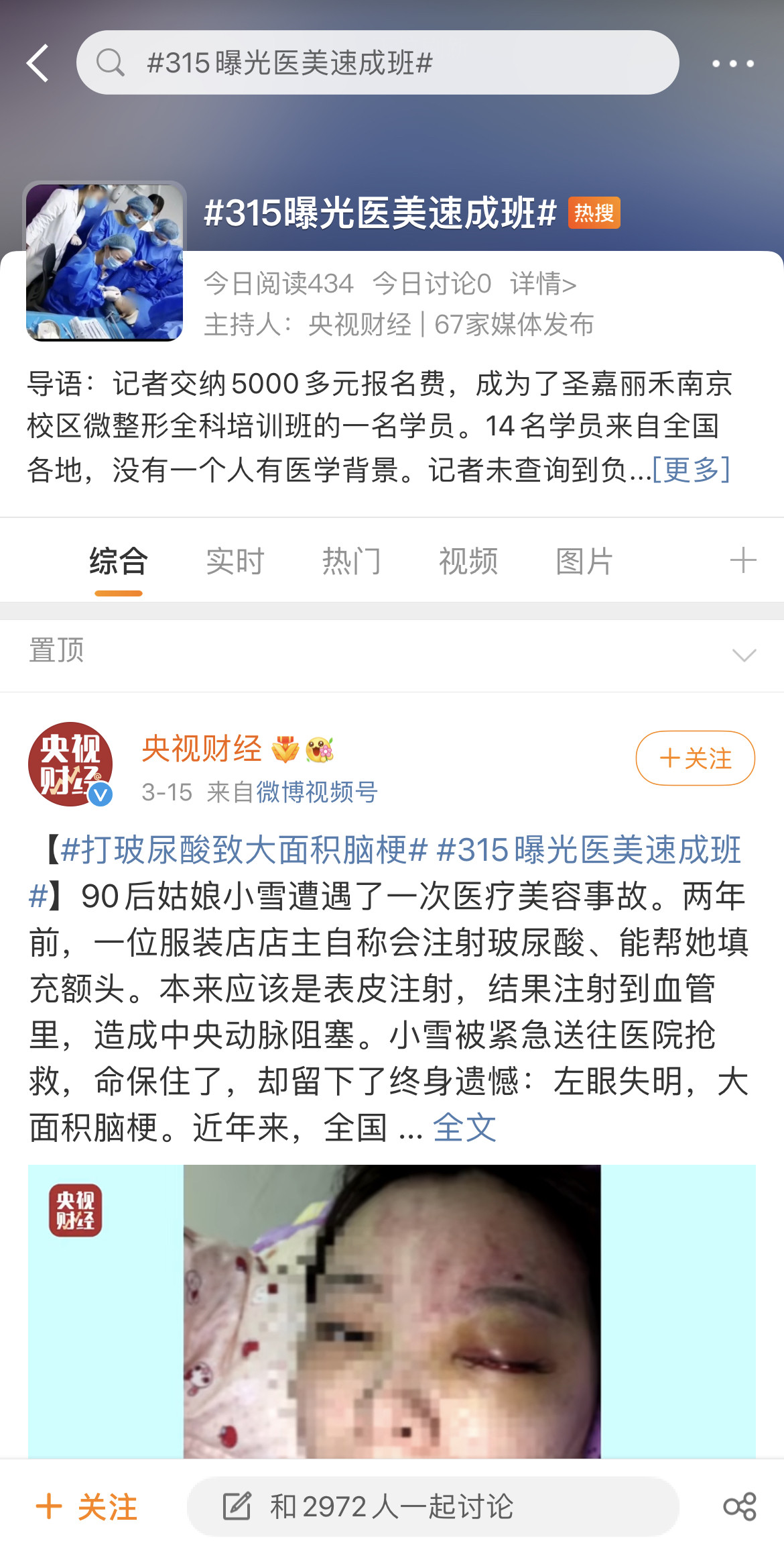 3月15日,主題為“公平守正,安心消費”的央視315晚會如期召開。在所有讓人“咬牙切齒”的侵權案件中,最後壓軸出場的是真正“慘不忍睹”的醫美培訓速成班。