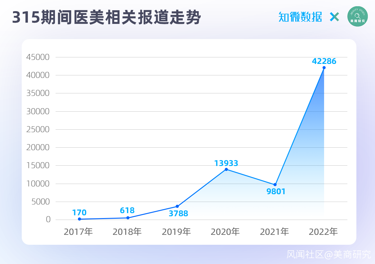 另據,搜揚美商研究院和知微研究院分析發現,近年來醫美行業負面報道呈幾何級數上升。特別是315期間的醫美相關監督報道逐年暴增。截至2022年3月,315期間中國醫美相關負面話題已達4萬餘條,較2017年同期上升300餘倍不止。