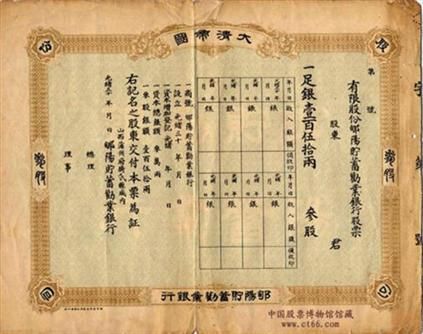 我因做會審官多年,認得洋人,費了許多力才買到若干股。買進時30兩銀子一股,買進後股票天天漲,最高漲到每股90多兩。許多外 國人知道我有股票,拿着支票薄,盯到門上,只要我肯賣,馬上簽字。然而……