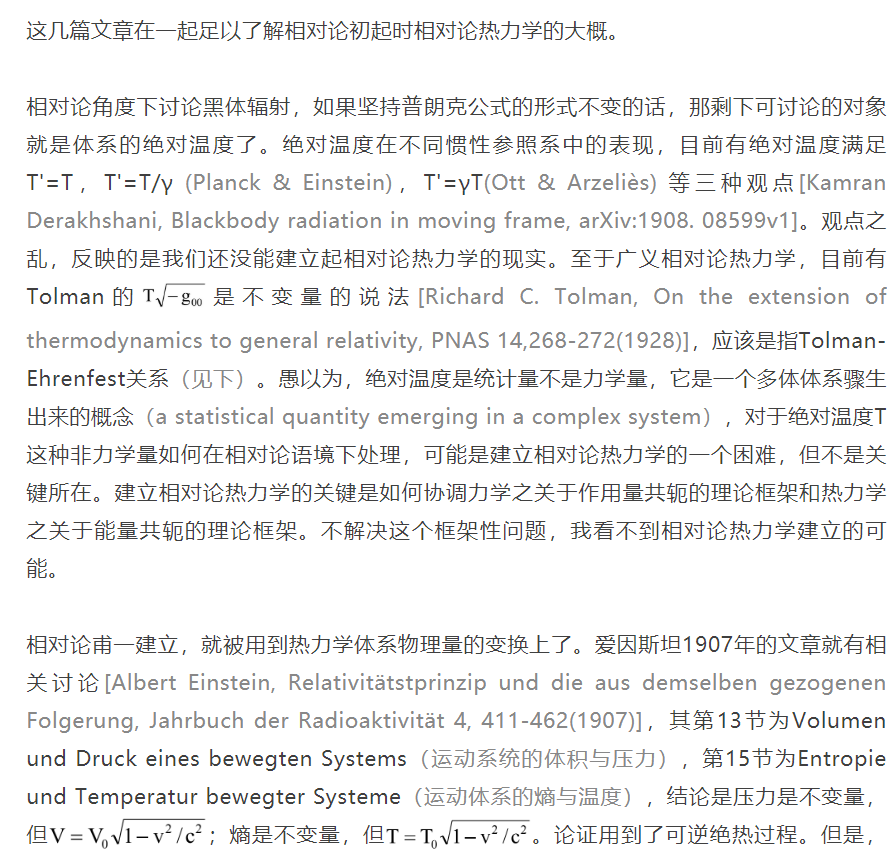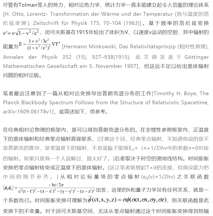 黑體輻射的學問從一開始就是相對論統計,因為它的對象是光。實際上,1905年狹義相對論甫一問世,普朗克即將之用於在相對論熱力學方向上培養博士,且於1906年即畢業了[Kurd von Mosengeil, Theorie der stationären Strahlung in einem gleichförmig bewegten Hohlraum(勻速運動空腔內靜態輻射的理論), Annalen der Physik 22, 867-904 (1907)]。熱的傳導方式之一是熱輻射,黑體輻射也叫熱輻射,因此用相對論的眼光看熱力學是自然的。沒有relativistic thermodynamics一章的熱力學教程是不完備的。粗略算來,相對論熱力學應該至少包括如下三方面的內容:1)黑體輻射公式的推導;2)運動空腔輻射體的運動學問題,這指向質能關係;3)温度T的洛倫茲變換。