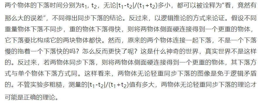 一個物理理論是否正確,首先要經受住邏輯判斷的考驗。一個存在內在邏輯矛盾的理論肯定是不正確的。物理史上有一個絕妙的例子,就是落體實驗。從前亞里斯多德的物理學主張在地面上重的物體下落較快。傳説中伽利略曾經從比薩斜塔拋下兩個鐵球,證明了不同重量物體同步下落(圖27)。後世有許多所謂或真或假的落體實驗,比如比較震撼的俺也不知道真假的月球表面的錘子與羽毛同步下落的視頻。不管這些實驗是真是假,實驗都無力證明“引力場中物體同步下落”(同步與否是個原則性問題而不是測量誤差問題)。且不説永遠沒有令人信服的同步開始下落以及到達落點的判定等問題,即便一切無礙,設測得的