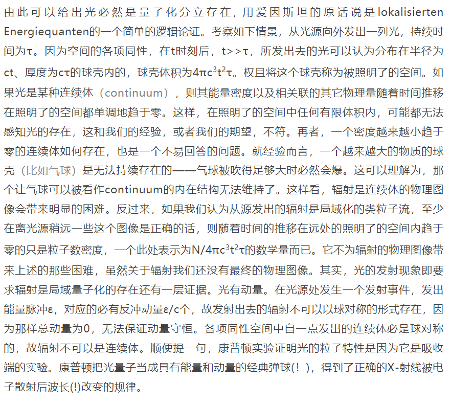 上述論證基於一個簡單的事實,輻射有個發射的過程。太陽的升起,讓我們知道光有關個發射的過程,這個説法未必正確,但是我們人類自己操控的柴火、電燈讓我們確信光有個發射的過程,有一個從無到有的過程。上述論證還是用了球波(spherical wave,不是球面波)的概念。從一個光源連續發出的光充滿以源為中心、半徑為cτ的球形空間。在三維物理空間中,點源發出的輻射,假設在近處可以用波近似的話,是球波。如果用平面波想象一束光,平面波的假象則會限制這個想法,因為平面波沒有無限延展變稀薄的問題。筆者想通這一點,來自福格特(Woldmar Voigt,1850-1919)對愛因斯坦1909年論文點評的啓發。三維空間的平面波,從字面上看就是個降維產物。平面波是個很壞的模型,極具誤導性。
