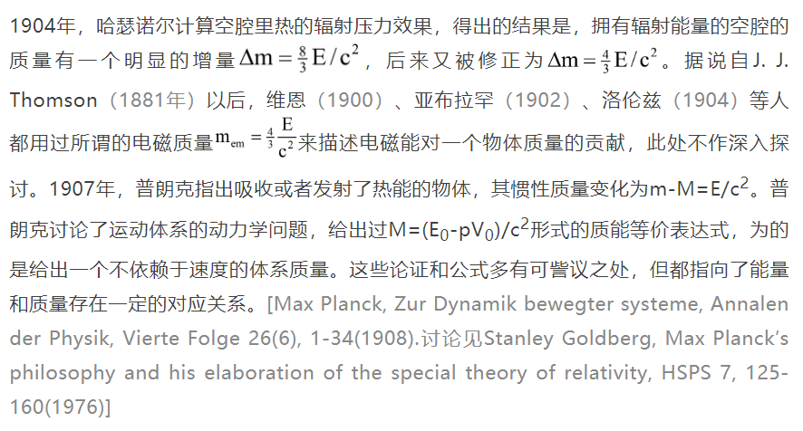 2. Friedrich Hasenöhrl, Zur Theorie der Strahlung in bewegten Körpern, Annalen der Physik 15, 344-370 (1904). 有英文本On the Theory of Radiation in Moving Bodies.