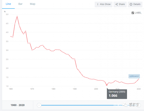 圖:德國國防軍費開支佔國家GDP比例的變化圖。上圖為1960年至2020年整體變化,下圖為2010年至2020年的詳細對比。