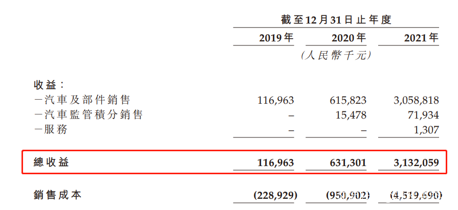 據零跑汽車招股書顯示,零跑汽車總收益由2019年的人民幣117.0百萬元增加439.7%至2020年的人民幣631.3百萬元,並於2021年進一步增加396.1%至人民幣3,132.1百萬元。其中,汽車及零部件銷售是零跑汽車的主要盈利來源,該項收入在前三年分別實現營收1.17億元、6.16億元以及30.58億元。