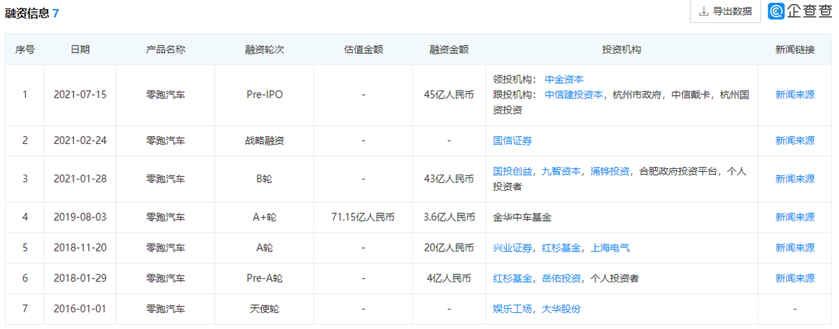 據企查查顯示,目前零跑汽車已進行7輪融資,已披露的融資金額超過110億元。其最近一輪融資是Pre-IPO輪融資,融資金額45億元。