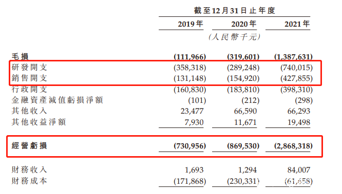 該公司招股書顯示,零跑汽車於2019年、2020年及2021年,研發開支分別為358.3百萬元、289.2百萬元及740.0百萬元。銷售開支分別為131.15百萬元、154.92百萬元、427.86百萬元。