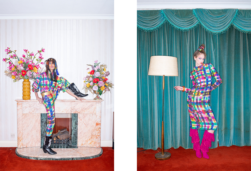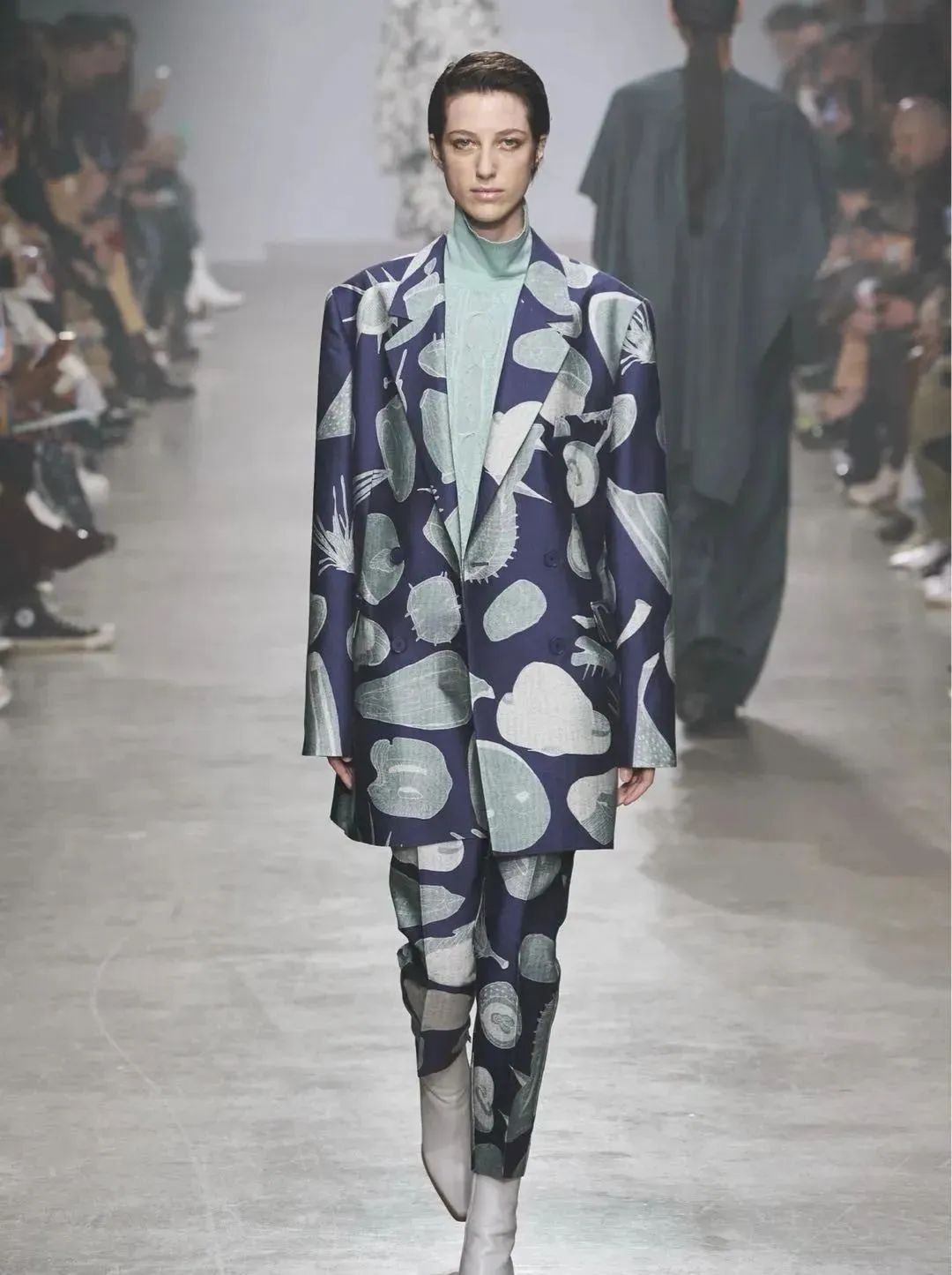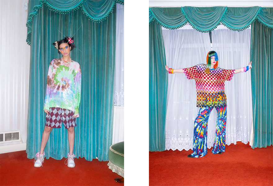 蒸汽波運用在服裝上的設計,戲劇性的廓形,各種面料的混搭,形成一種獨特的視覺感受,復古又充滿趣味。