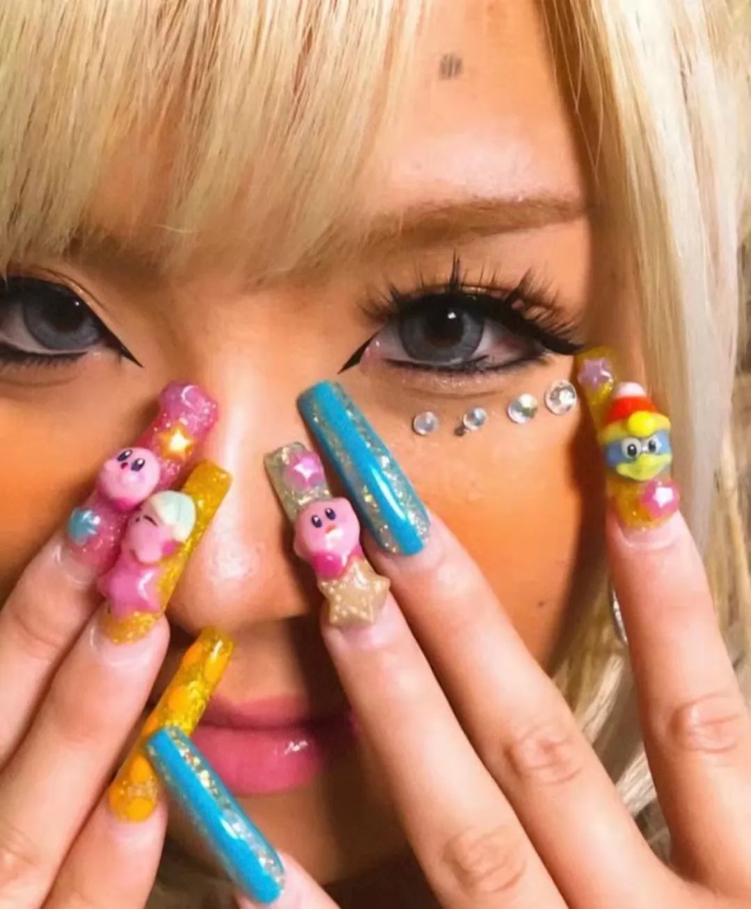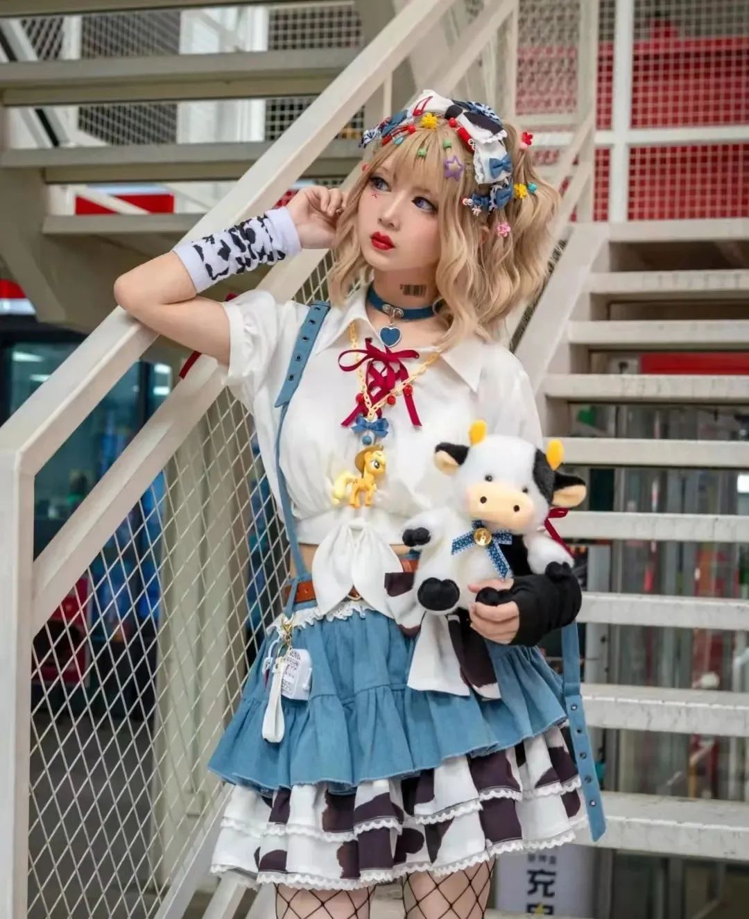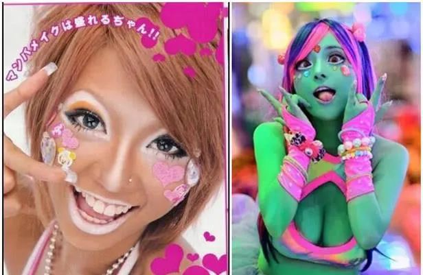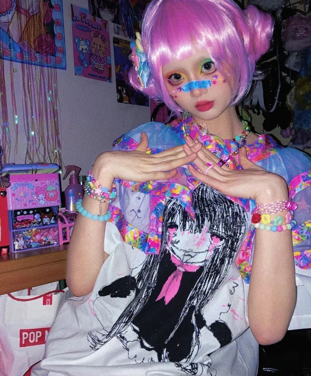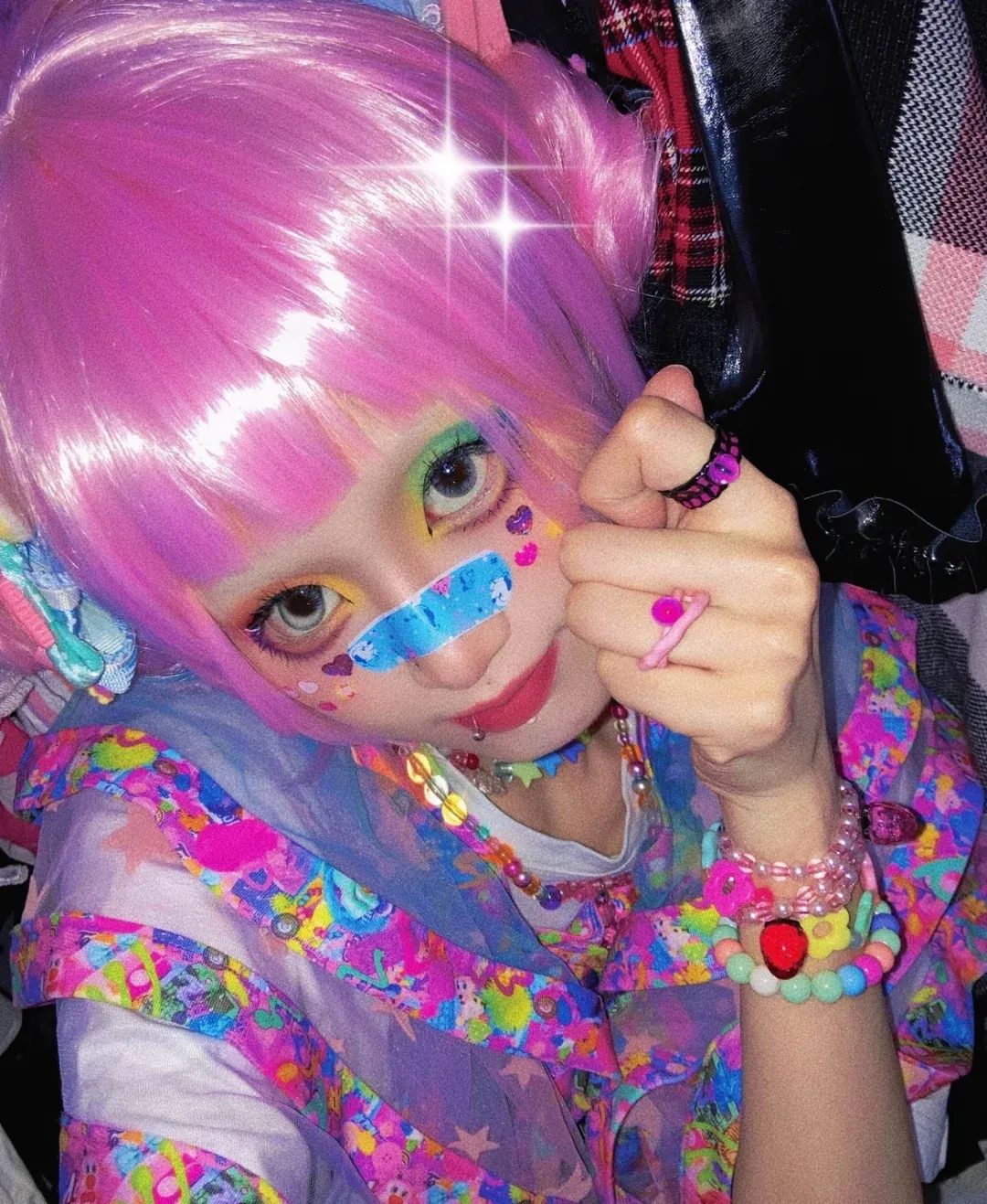 原宿愛好者喜歡在頭髮上、臉上、身上佩戴很多可愛的裝飾物,染上五彩繽紛的頭髮,再將可愛的貼片、亮片無限制的往身上疊加。