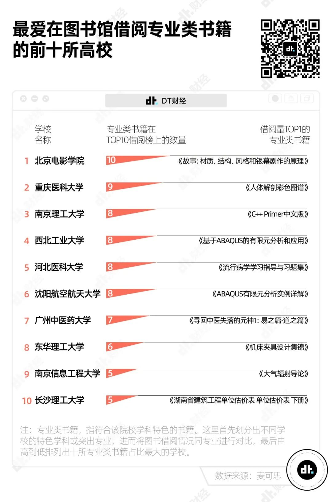 其中,北京電影學院的專業濃度最高。借閲量前10的書籍全部都是藝術類的專業著作,被譽為編劇必讀經典的《故事:材質、結構、風格和銀幕劇作的原理》輾轉過最多人之手。