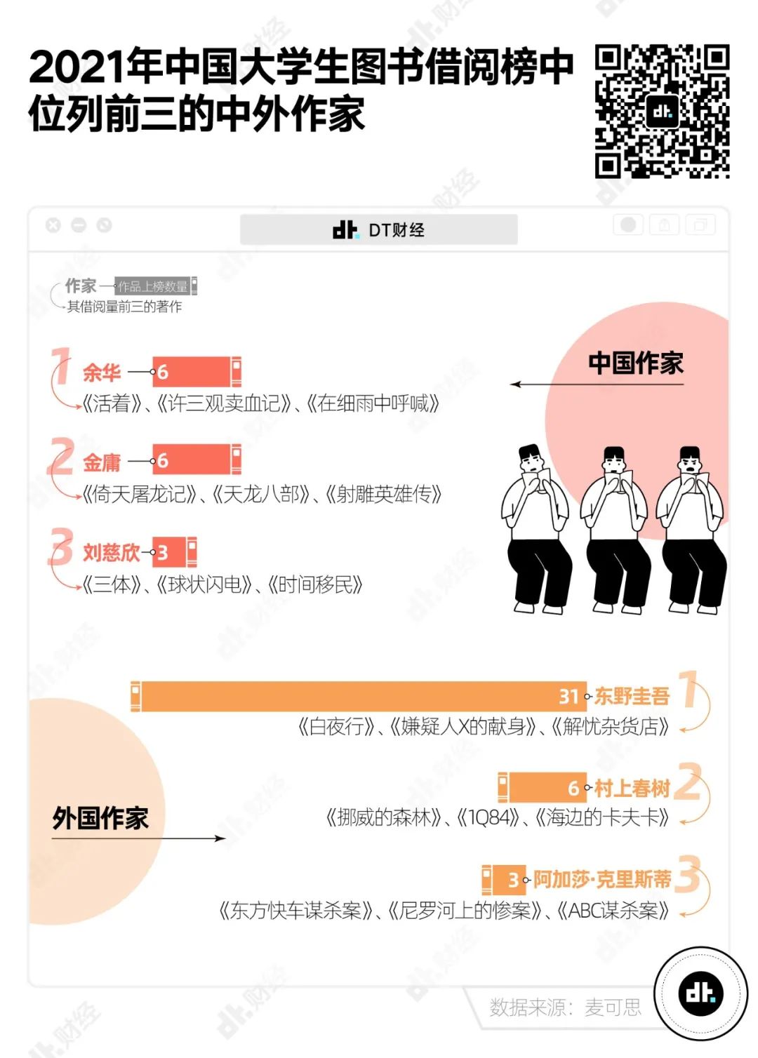 日本推理大師東野圭吾也當仁不讓,有4部作品登上TOP20榜單。若放眼整個圖書借閲榜,以高產著稱的東野圭吾足足有31本作品在多所高校被反覆借閲,在所有作家中排名第一,堪稱高校圖書館的扛把子。
