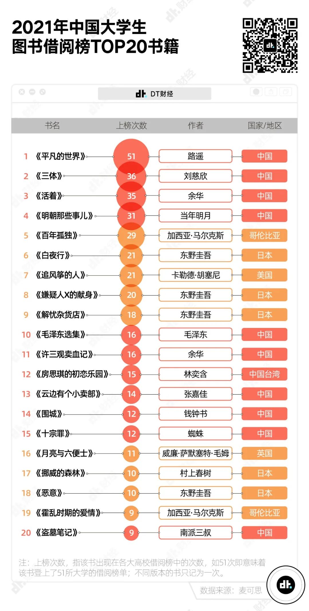 《平凡的世界》是大學生借閲最多的著作,共登上了51所高校的借閲熱榜。劉慈欣的《三體》與餘華的《活着》分別以36次和35次位列其後。