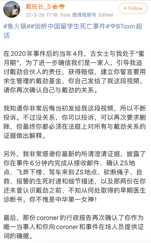 隨着戴爸爸在微博曝光了該事件,古女士也做出了回應。這次她不再稱呼戴勁為普通朋友,而是“一生摯愛”。