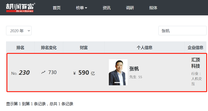 2022年3月,現任匯頂科技董事長兼CEO的張帆以245億財富位列《2022年胡潤全球富豪榜》第900名。