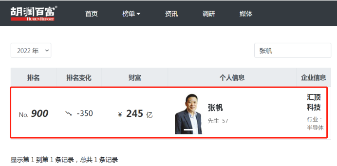 2022年3月,現任匯頂科技董事長兼CEO的張帆以245億財富位列《2022年胡潤全球富豪榜》第900名。
