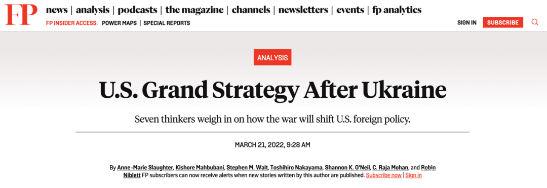 【導讀】近一個月來,俄烏衝突引發持續關注。近期美國《外交政策》邀請七位外交政策研究人員,分別是安妮-瑪麗·斯勞特(Anne-Marie Slaughter),馬凱碩(Kishore Mahbubani),斯蒂芬·沃爾特(Stephen M. Walt),中山俊宏(Toshihiro Nakayama),香農·奧尼爾(Shannon K. O’Neil),拉賈·莫漢(C. Raja Mohan)與羅賓·尼布萊特(Robin Niblett),討論後烏克蘭戰爭時代的美國大戰略(U.S. Grand Strategy After Ukraine),分析這場戰爭將如何轉變美國的外交政策,包括後烏克蘭戰爭時代下歐洲的戰略定位、中美關係、美國與其亞洲同盟之間的關係,以及烏俄事件對美國的警示等問題。