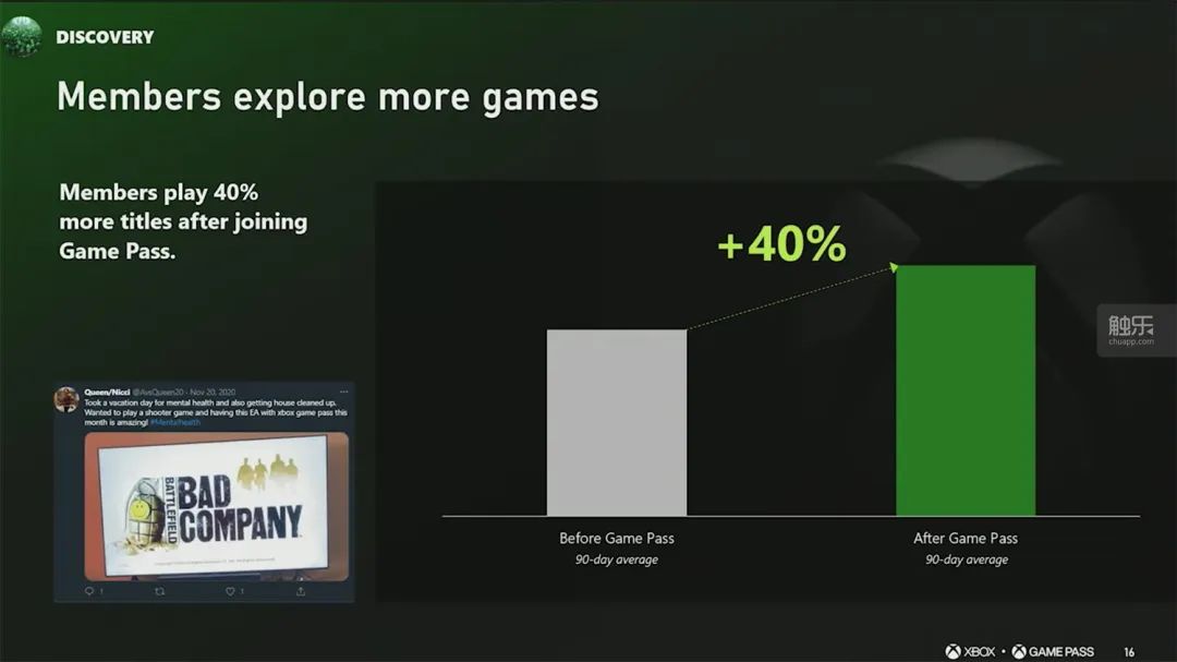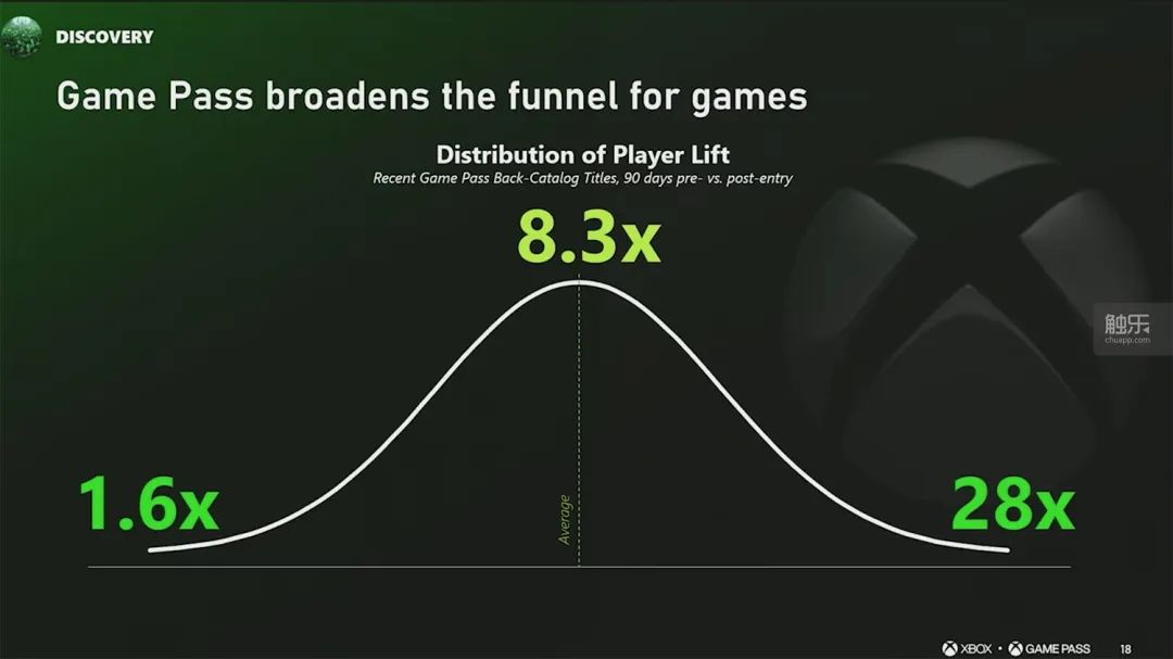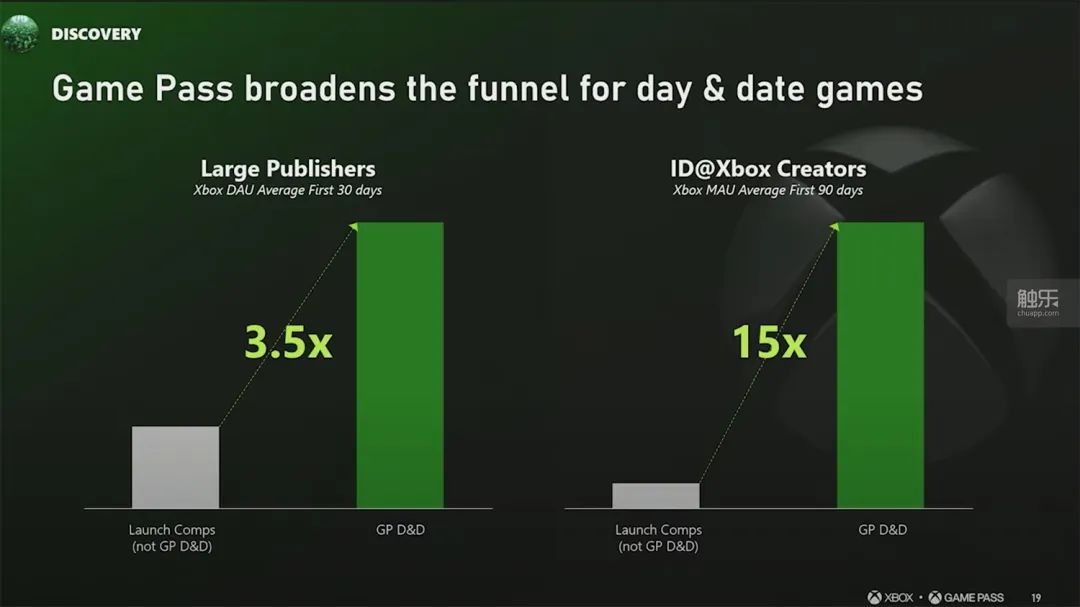 又如,遊戲加入XGP後,玩家數量平均漲幅達到了8.3倍,實際增量更是明顯向獨立遊戲、中小開發團隊作品傾斜,最高甚至可以達到28倍。與此同時,如果首發加入XGP,那麼遊戲的日均活躍用户數量(DAU)會增長3.5(大型廠商)至15倍(獨立開發者)。此外,在玩家社區、社交媒體曝光度等等方面,XGP會員對遊戲的助力也很明顯。