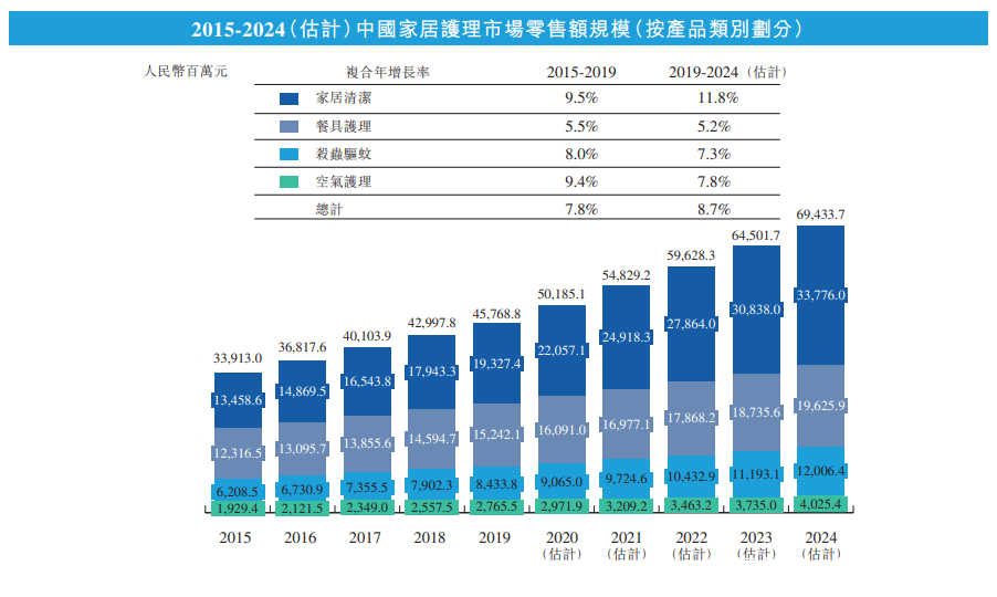 中國擁有全球第二大的家居護理市場,僅次於美國。中國家居護理行業零售額從2015年的人民幣339億元增長至2019年的人民幣458億元,對應複合年增長率7.8%,增速遠高於全球增速3.6%。預計未來中國該行業的零售額將進一步增長至2024年的人民幣694億元,自2019年起的複合年增長率為8.7%。