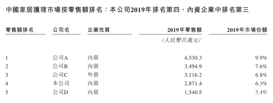根據灼識諮詢數據,以零售額計,2019年朝雲集團在中國家居護理行業的所有公司中位列第四(市場份額6.3%),本土公司中位列第三,其中多個細分賽道公司表現優異:在殺蟲驅蚊市場中位列第一(市場份額22.8%),兒童適用殺蟲驅蚊市場位列第一(市場份額41.4%),在家居清潔市場中位列第二(市場份額4.2%),在空氣護理市場中位列第二(市場份額4.9%),在花露水市場中位列第三(市場份額2.2%)。公司在2019年進入寵物護理行業,按零售額計,2020年上半年在寵物除臭劑類別位列前五。2020年倔強的尾巴通過天貓旗艦店上市四個月即實現香水除味類目品牌排名第一。