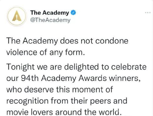 當晚的頒獎儀式上,威爾·史密斯憑藉《國王理查德》中扮演網球巨星維納斯和塞雷娜的父親理查德·威廉姆斯而獲得最佳男演員獎。他為之前的衝動之舉道歉,但沒有直接向克里斯·洛克致歉。他還調侃道,希望奧斯卡頒獎儀式以後還會邀請他。
