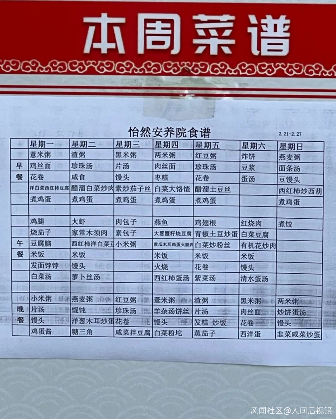 “(那些養老院)給飯的時候,都是控制量的,為了節省成本。護工餵飯的時候,最多問一句‘還吃不吃了?’”肖淑芬説,“你知道,有些老人是不怎麼能説話的,那護工也不管他,感覺他吃飽了就行。沒人在乎老人喜歡吃什麼,討厭吃什麼,都是有什麼喂什麼。但怡然是老人想吃多少就吃多少,從來不會明裏暗裏給你設限,院長和護理員吃的菜是一樣的,頓頓有肉,老人還會加一道專門的肉菜。”