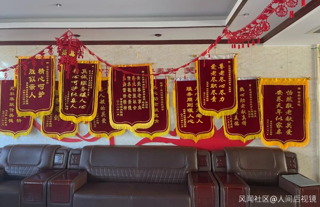 怡然安養院明文規定,不允許職工接受老人和家屬的任何禮物和紅包,如果老人想要感謝護理員或職工,可以花80塊錢做一面錦旗,職工每收到一面錦旗,院方就獎勵職工100塊錢。如今,大廳的牆上,錦旗已經沒地方掛了。